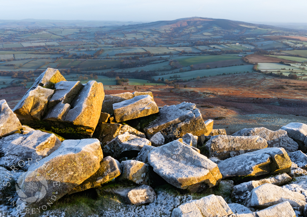 Later, I got this shot of Brown Clee seen from the summit of Titterstone, separated by a patchwork of fields.