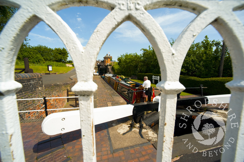 A canal boat passing through Bratch Locks at Wombourne, Staffordshire, England.